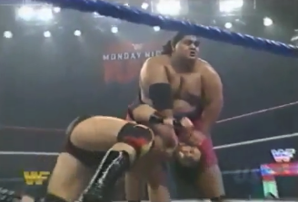| Back from break, the champions are clobbering a jobber in a two-tone singlet. Samu hits a DDT from the second rope on Joey Stallings, goes for the pin, but lifts him off the mat before three. It's notable that the Shrinkers have not changed their style even though they are faces. Samu knocks Barry Hardy off the apron, setting him up for a slap from Fatu. As the champions put Stallings in a double-front leg sweep, Ross wonders whether they will defend their titles at Summerslam. Yes and no, JR. Fatu flattens Joey with a splash from the top rope for the pin without Barry Hardy even getting TV time in the ring. |