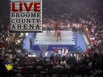 | Reigning tag team champions Owen Hart and Yokozuna come to the ring to take on Bill Weaver and Nick Barberry. Before the prevalence of Titantron videos, the best a wrestler got was special lighting for their entrance, which in the case of Owen and Yoko is a playing card-like image of the King of Harts sandwiched between Japanese characters. Owen offers Jerry congratulations for beating brother Bret. Jerry says hi to his mom on the air. Jim Cornette trash-talks fans at ringside, telling them, "See what happens when a fetus don't get enough oxygen!?" Shortly into the match, both scrubs try to take down Yokozuna simultaneously, only to take simultaneous clotheslines. Owen tags in to deliver a spinning heel kick, a Maneuver (#1) which was a favorite of Kwang and will be used often by newcomer Savio Vega. The Allied Powers, says Vince, are looking forward to a title shot, which they have earned by beating the Blu Twins and a team of jobbers a few weeks back. Yokozuna tags back in to deliver a uranage to Bill Weaver, and FOOOOOR-get about it! The champions pick up the victory, while Jerry Lawler picks up where he left off weeks ago and accuses Bret Hart of being racist against the Japanese. Yokozuna continues to cover Weaver for a very long time after the bell while Owen puts on both belts. |