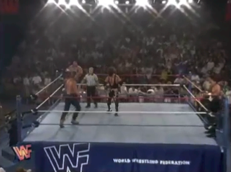 | Jarrett is back in control when the show returns. Vince notes that Savio's ribs must hurt after taking a splash from Mabel. Hopefully they're not as real bad as Razor's are. Savio turns things around after dodging a guillotine splash on the second rope. Vega hits a uranage on Jarrett, but gets his foot caught by the Roadie while running the ropes. Savio then boots the Roadie into the announcers' table, where Michaels shoves him away. This leads to a confrontation between the two future DX members. Amidst the distraction, Vega rolls up Jarrett for an apparent victory until the Roadie clotheslines him, drawing a DQ. Shawn comes to Vega's rescue, so his music plays instead of that of the guy who actually won the match. |