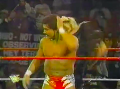 | Wildman Marc Mero turns the match around for his team by hitting a Tremendous Maneuver (#1 - flying headscissors) on Helmsley. Honky Tonk disagrees with McMahon, stating it was merely a “very good maneuver,” but admitting that if Helmsley had landed on his head, it would have been “devastating.” Goldust finally gets the tag and goes ape on Hunter, even uppercutting him in his “prominent proboscis.” Hunter ends up tied in the ropes, allowing Goldust to choke him. The referee disqualifies Goldust’s team, leading to the Bizarre One and the Wild Man exchanging blows after the match. |
